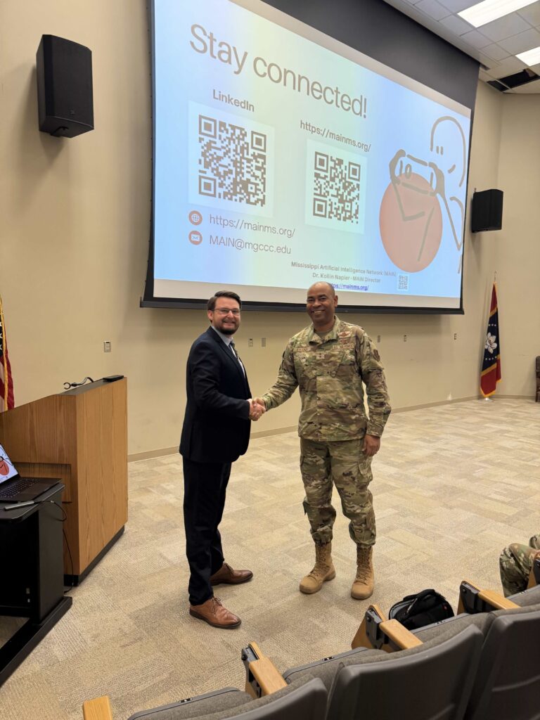 Last week, Dr. Kollin Napier, Ph.D., Director of the Mississippi Artificial Intelligence Network (MAIN), had the opportunity to brief the Mississippi Air National Guard at the Gulfport Combat Readiness Training Center (CRTC) on AI and workforce readiness. Representing MAIN, Dr. Napier shared updates on the network’s continued leadership in advancing AI across the state and […]